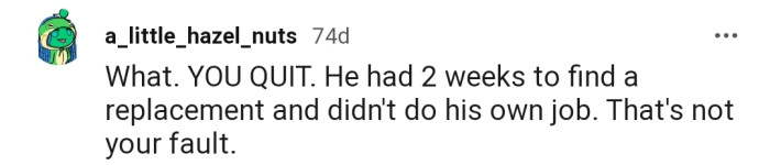 "He had 2 weeks to find a replacement and didn't do his own job."