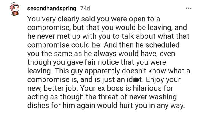 Reddit.comSurprisingly, their name appeared on the new schedule. But OP decided to leave anyway