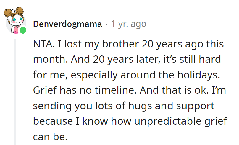 OP asked if he thought her depression was a choice, and on their mom's two-year death anniversary, he questioned her ongoing grief.