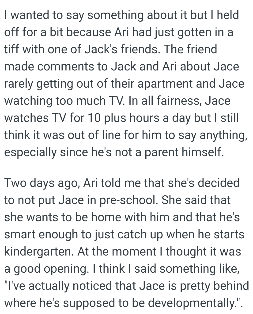 Later on, Ari revealed she wouldn't be putting Jace in preschool, and that's when the OP spoke her mind. However, the OP didn't expect the reaction she received from Ari, and you can read the full story below to find out.