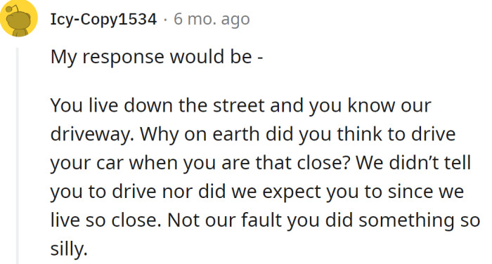 This driveway requires cars to be reversed onto it, a fact well-known to MIL, who has visited the house over the past five years. Despite knowing this, MIL chose to drive forward onto the driveway during her visit to feed the cats, which resulted in damage to her car's front bumper and the detachment of the plastic beneath it.