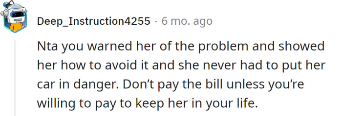 Redditors agreed with the OP that it's not their fault MIL didn't listen to them. They shouldn't pay her for repairing the car unless they want to keep her in their lives and if it's the only solution for everyone to be happy.