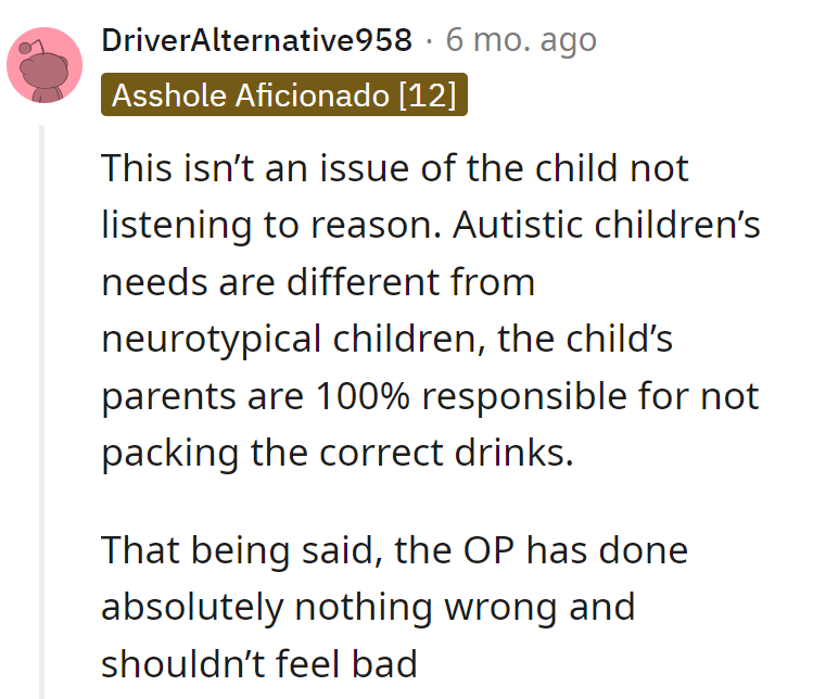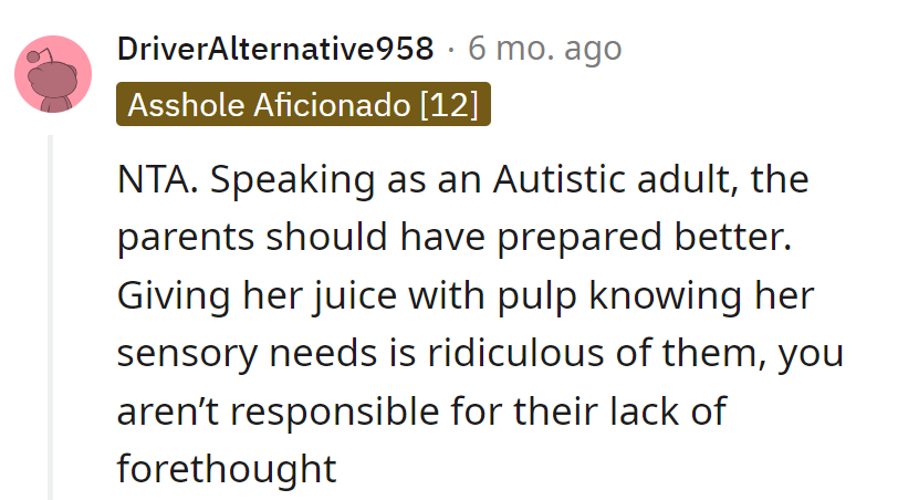 In a situation like the Reddit story, where a diabetic individual chooses not to share her juice with her autistic niece due to her own health requirements, it becomes a lesson in boundary respect and health priority. While the niece's sensory issues are undoubtedly challenging, they do not override the medical necessity of another person.