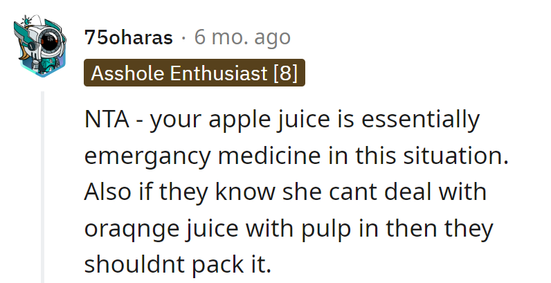 RedditDiabetic and prepared, she refused to switch juices with her brother, citing the need for sugar in case of a sudden low blood sugar episode.