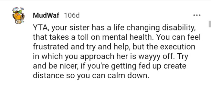 Physical disability comes with its own emotional impact, and the OP's sister has chosen hers, but that doesn't make her actions right. Redditors understood the OP's point, and after all the back and forth, the OP was declared "not the AH."