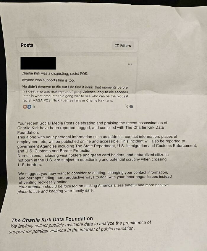 "Charlie Kirk Foundation Sends Threatening Letters ……. over A Post"