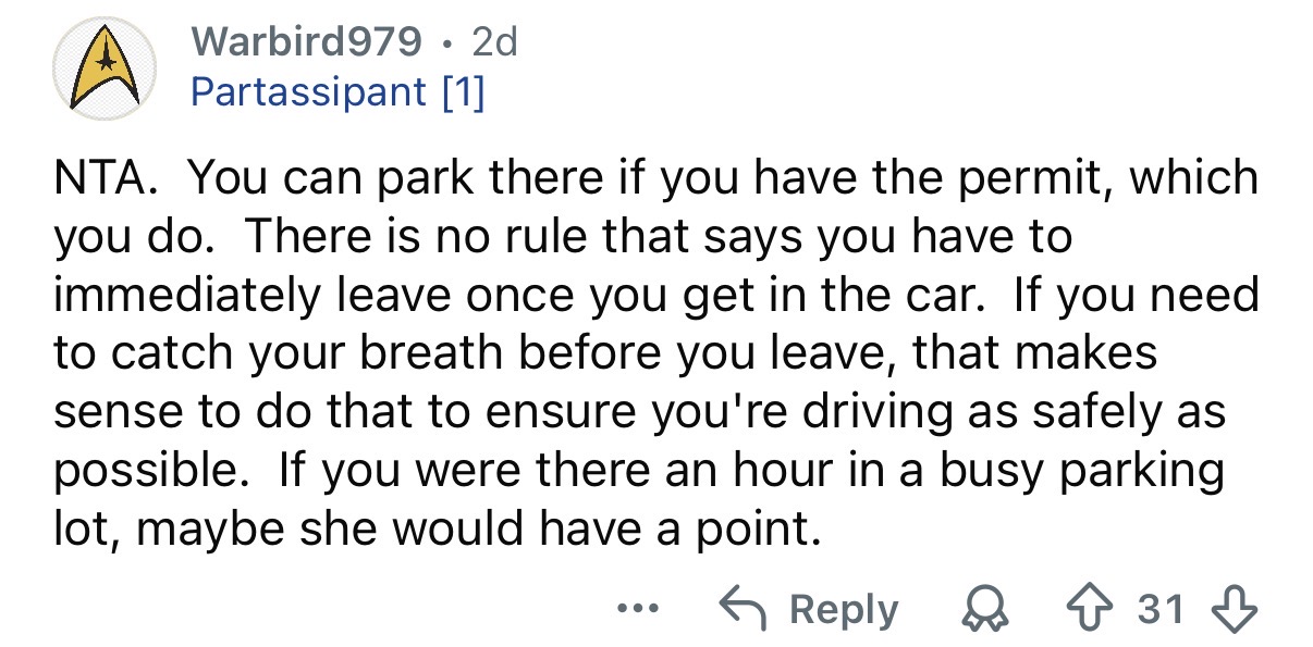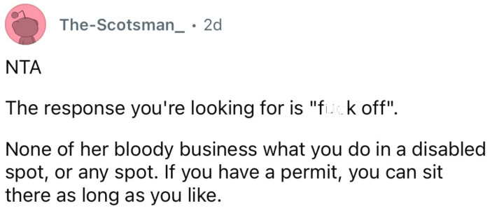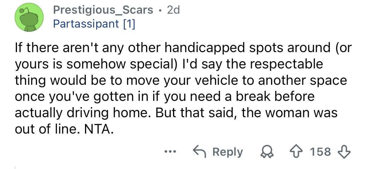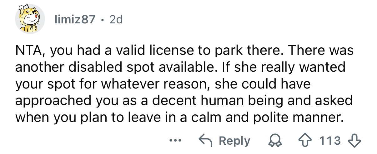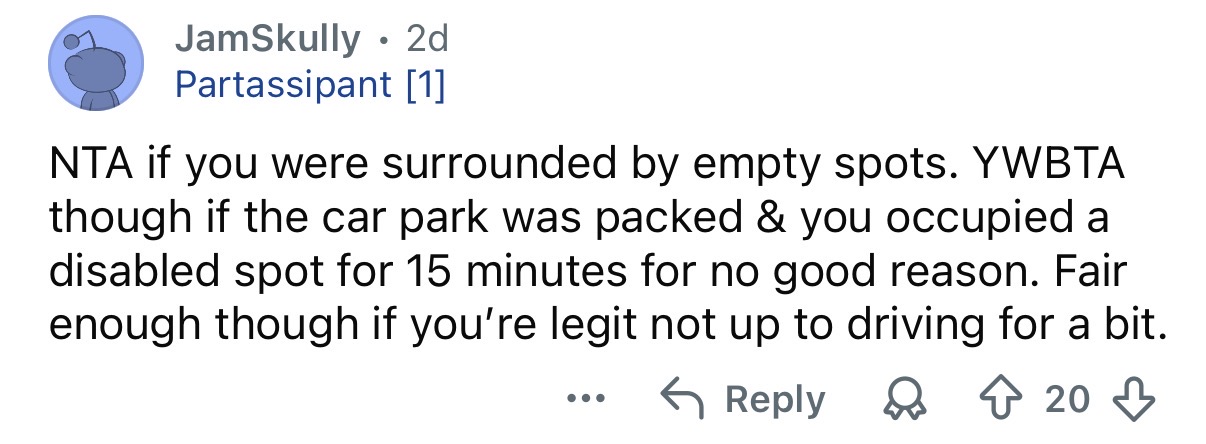 I’m 25M, disabled, and I have a valid disabled parking permit. I drive an older BMW, a nice one (imo).After my physiotherapy, I walked back to my car, parked in a disabled parking spot. I got in and spent a few minutes on my phone before heading home. Just taking a short breath, i always do that after physio.The parking lot was nearly empty. Next to me were three regular open spots, and across from me there was another empty disabled spot with two free spaces beside it. And it’s a free parking area, by the way.Then a woman, somehere mid-60s, drives up. She stares at me for a few seconds, then parks her car half almost crisscross across the disabled spot opposite me. She gets out, walks straight up to my window, and says: “Why are you taking up a disabled spot? You’ve been sitting here playing games for fifteen minutes, and I want to park here.” Honestly, I was a bit surprised . So I said, “I’m allowed to park here. I was just doing something on my phone and was about to leave.”Before I could even finish my sentence, she cuts me off: “You don’t need to justify yourself.” Yet she keeps going, telling me it’s rude of me to sit there and that I should move over because she “can’t park her car anywhere else, because its too long.”She came iver a bit rude. I tried to stay polite, but I could feel the frustration creeping in. This kind of thing happens sometimes tho, someone sees a young guy in a car and immediately assumes he’s abusing a disabled spot. No one sees why that blue card is there in the first place.Eventually, she walked away mid-sentence. And I was a bit confused. I wasn’t blocking anyone, I had a valid permit, and I was planning to leave.So was I really being rude, or was she just frustrated?Edit: i think i stood there for 5, maybe 6 minutes. No longer. As for my disability, i have Friedreich Ataxia. I currently walk with a walking stick, am a bit wobbly when standing, everything costs energy and my voice is a little disorted. It doesn’t get any better. When i sit i look completely ‘normal’. Not for pity, just understanding.Misconceptions Around Disabilities