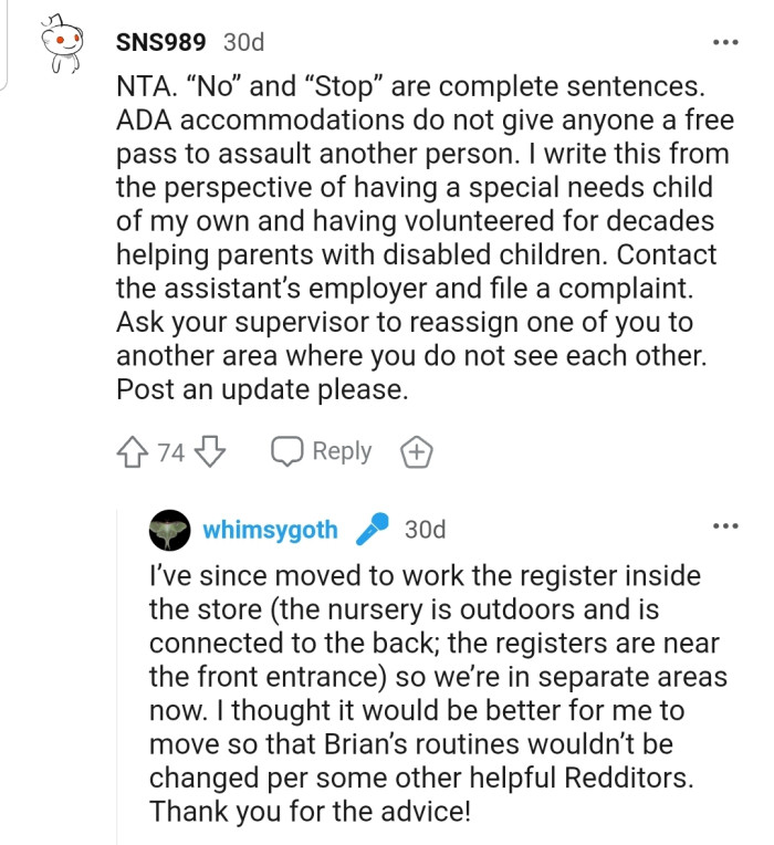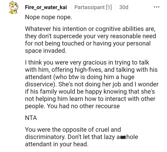 The next day, OP explained their dilemma to their coworker’s attendant so she could better explain the situation to him, but the attendant disregarded OP’s feelings.