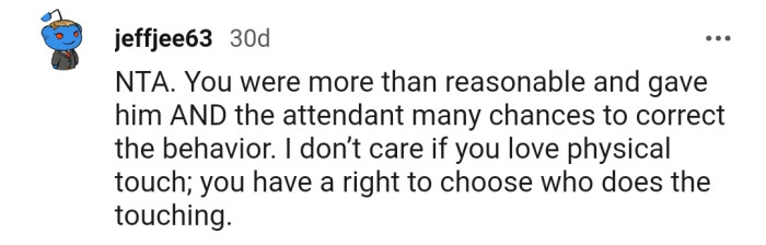 "You were more than reasonable and gave him AND the attendant many chances to correct the behavior."
