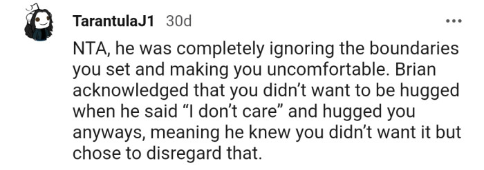 The commenters believe OP is NTA. According to them, people should respect boundaries, and Brian was made aware of OP's discomfort in a respectful way.
