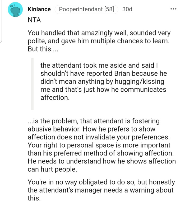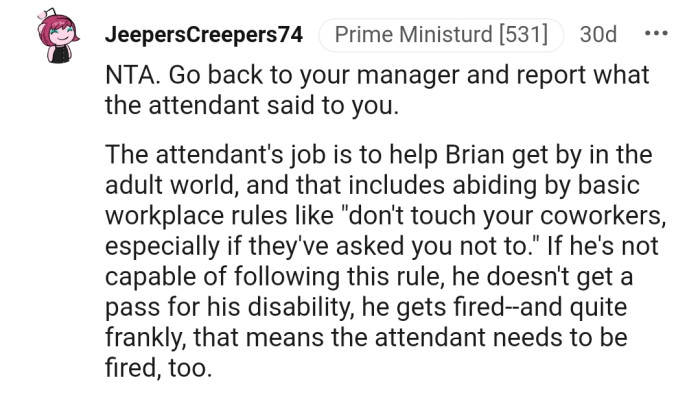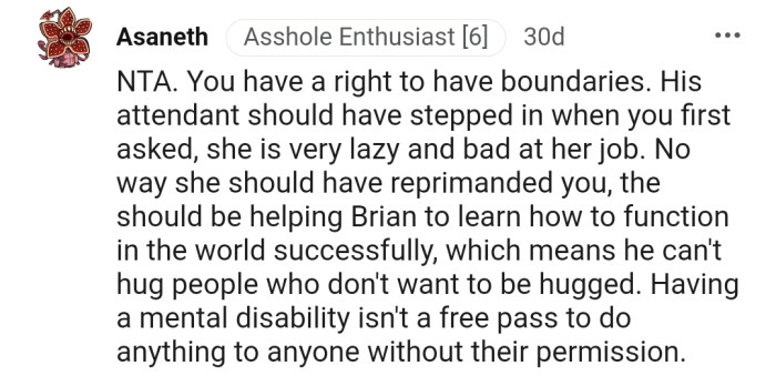 Reddit.comBrian has a habit of hugging people, which OP doesn't like. After speaking with him and his attendant about it, nothing seemed to change