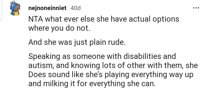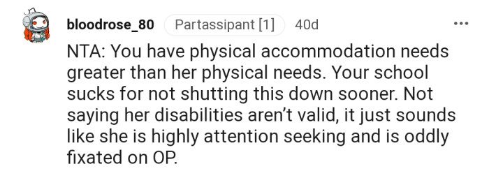 "Not saying her disabilities aren’t valid, it just sounds like she is highly attention-seeking and is oddly fixated on OP."