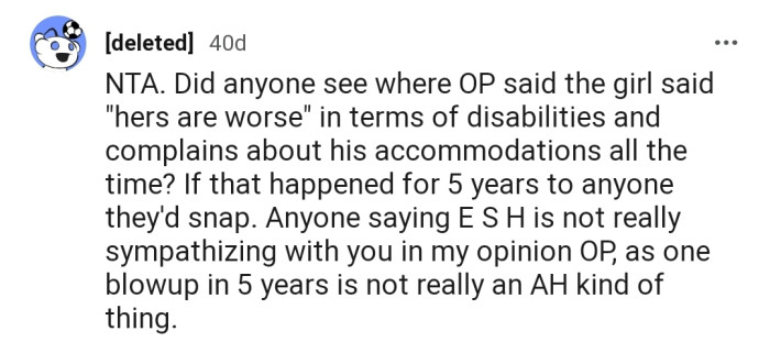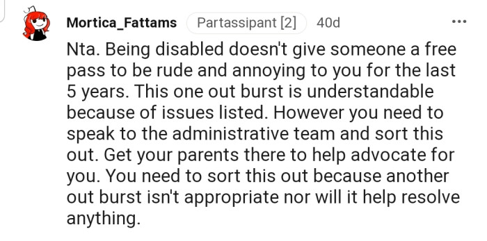 "NTA. Being disabled doesn't give someone a free pass to be rude and annoying to you for the last 5 years"