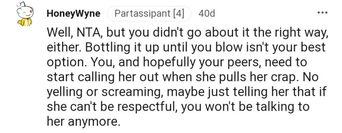 "Well, NTA, but you didn't go about it the right way, either. Bottling it up until you blow isn't your best option."