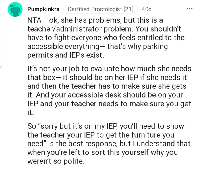 "NTA—okay, she has problems, but this is a teacher/administrator problem. You shouldn’t have to fight everyone who feels entitled to the accessible everything"