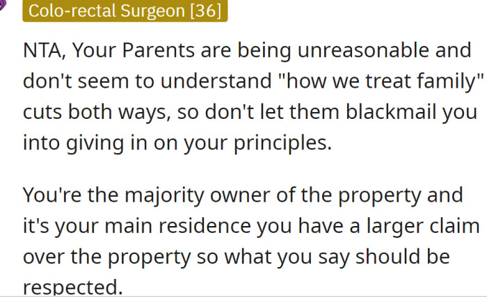However, the parents disagree with this and indicate it's all in the OP's head. The parents also now demand that the OP either let the brother stay or buy out their share immediately.