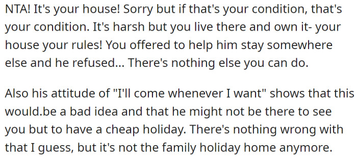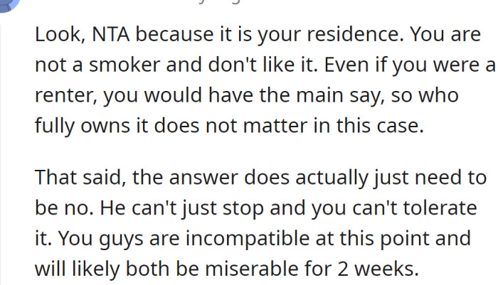 Redditors told the OP that since he lives in the house, he has the final say. They also agree with him that the smell of smoke is too strong to tolerate, and they understand his position.