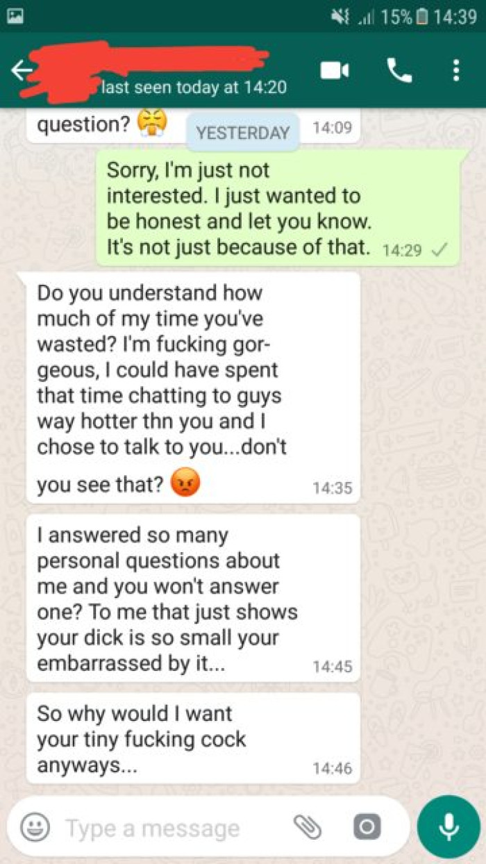 Our culture needs to do a better job of not judging everyone who's ever been rejected as a "loser." We create these massively high stakes for ourselves with every potential romantic match.Add in the relative anonymity of the internet that makes people feel free to say things without thinking them through first, and it's no surprise we see stuff like this coming from both men and women.How can someone blow up like that?