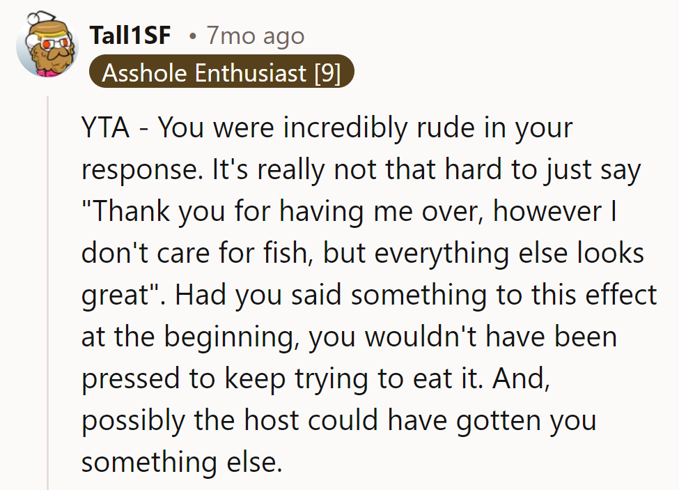 The person in question didn’t eat the fish served, choosing instead to stick to salad. Despite their efforts to be polite and unobtrusive, family members kept pressing them about why they weren't eating the main dish.