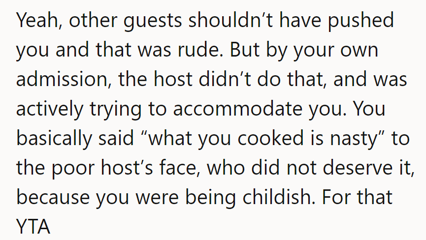 In family gatherings, where emotions and expectations run high, finding a gentle way to handle such situations can prevent misunderstandings and hurt feelings. Perhaps a more diplomatic approach, like quietly explaining a personal preference or expressing gratitude for the effort put into the meal, could have mitigated the fallout and preserved the harmony of the evening.