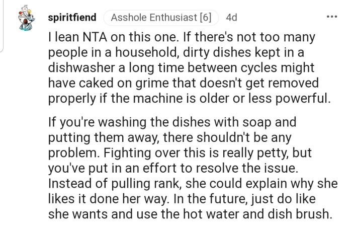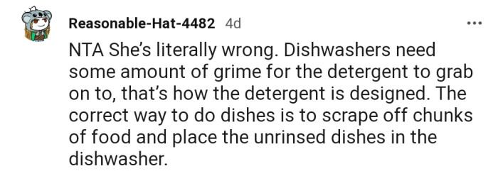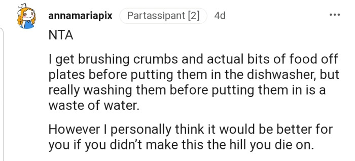 The commenters believe OP is NTA. Many agree with their sentiment that there is no need to wash the dishes first before putting them in the dishwasher.