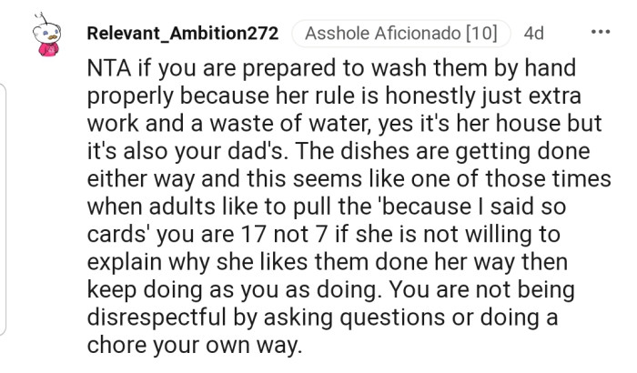 Whose method of washing dishes do you agree with? OP’s or their stepmother’s? Let us know your thoughts in the comments below!