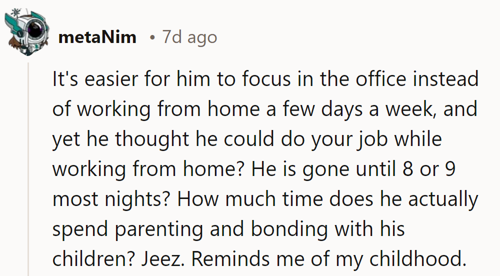 This scenario is a classic example of "walking a mile in someone else's shoes." It’s easy to underestimate someone else’s daily grind until you’re the one doing it. This dad’s work-from-home day ends up being a crash course in Parenting 101, showing that managing kids while working isn't as easy as it looks.