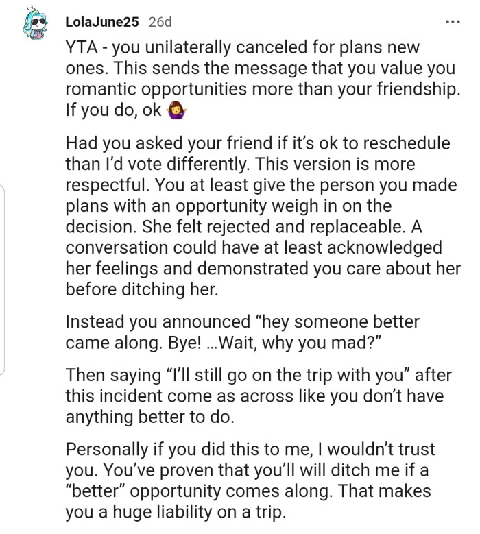 "Personally, if you did this to me, I wouldn’t trust you. You’ve proven that you’ll ditch me if a 'better' opportunity comes along."
