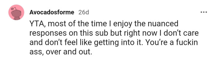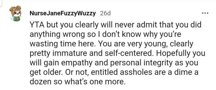 "YTA, but you clearly will never admit that you did anything wrong, so I don’t know why you’re wasting time here."