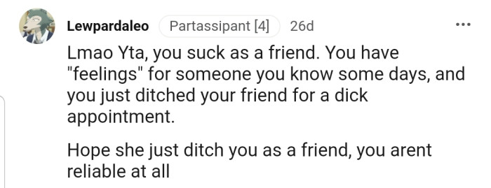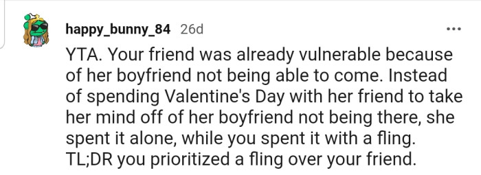 "You prioritized a fling over your friend."
