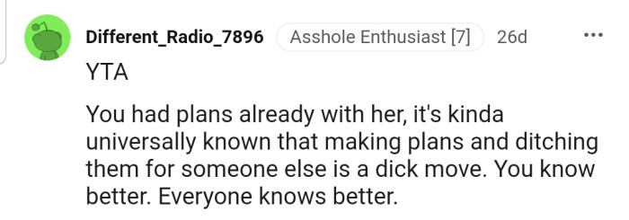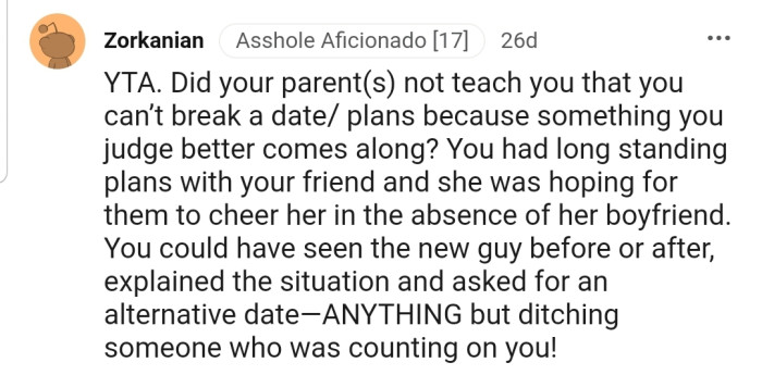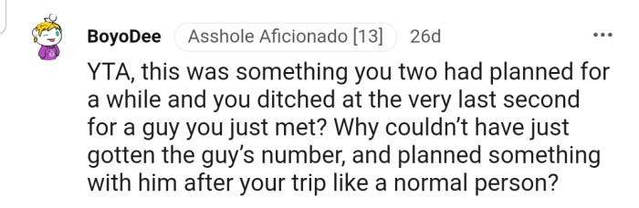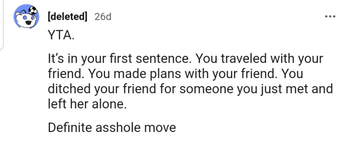 "You ditched your friend for someone you just met and left her alone. Definite asshole move."