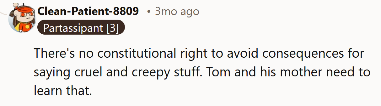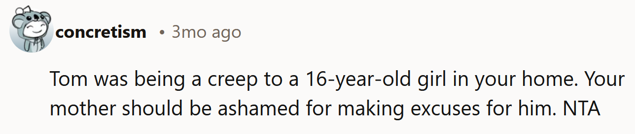 The OP's mother defended Tom and said the way he was treated was horrible. However, the Redditor didn't back down and told her mother that he didn't have the right to say disgusting things in her home.