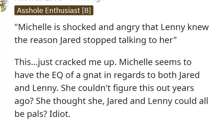 They got back in touch years later, and it turned out Jared had feelings for Michelle, and Lenny knew that: