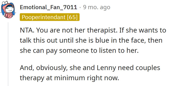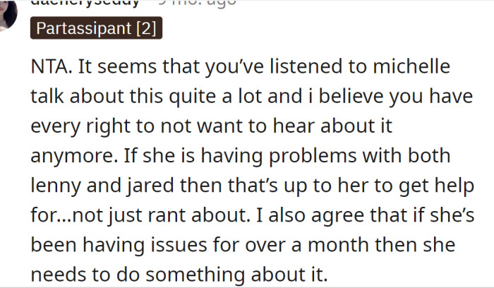 By supporting a friend in need, you show them how much you value your friendship and care for them, but telling a friend the truth should also mean the same. According to Redditors, the OP was not in the wrong for telling her friend to either do something about her problem or stop complaining.