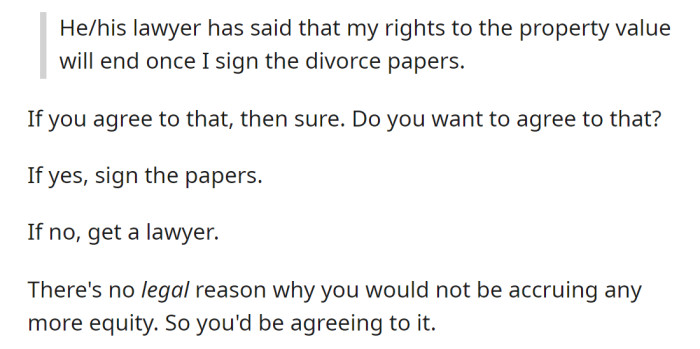 "His lawyer has said that my rights to the property value will end once I sign the divorce papers."
