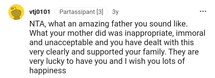 "What your mother did was inappropriate, immoral, and unacceptable, and you have dealt with this very clearly and supported your family."