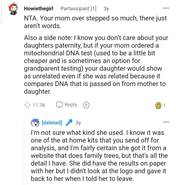 One day, OP’s mother had to watch the kids for a few hours. Later, she revealed that during this period, she had conducted a DNA test on OP’s daughter, using her DNA, and found out OP wasn’t biologically related to his daughter.