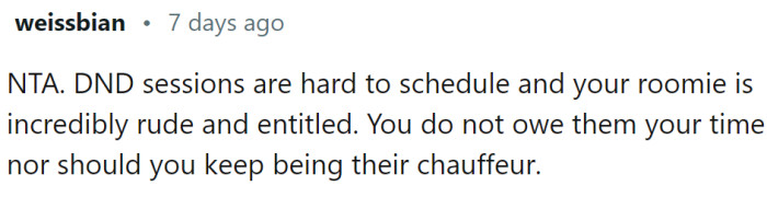 However, during one anticipated DnD session, a roommate requested OP to drive them to pick up supplies for their date, suggesting that OP could afford to be late to the game.