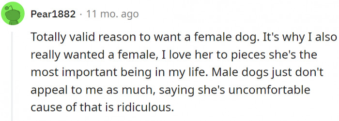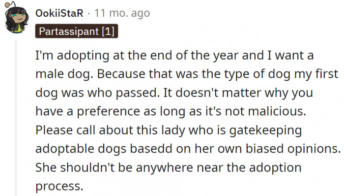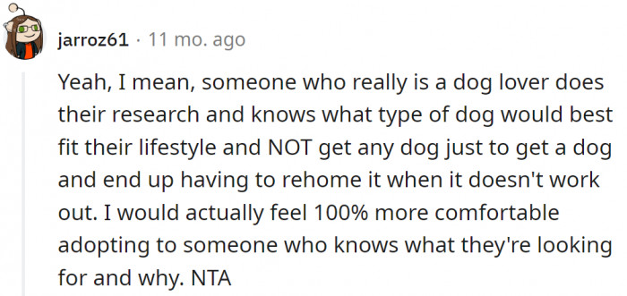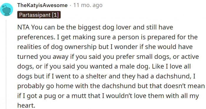 The Redditors encouraged her to try again and adopt a dog that she prefers. It's perfectly normal to love all dogs but have preferences when it comes to taking one home with you.