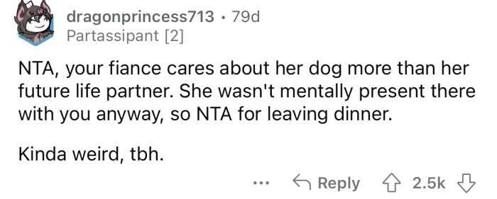 The OP asked if he's an a**hole for leaving his engagement dinner early because of his fiancée's obsession with their dog.