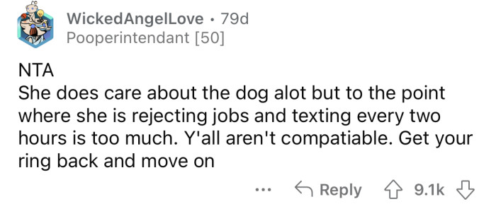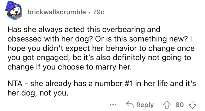 The Redditor mentions that he had some bad experiences with dogs as a child, so he is not as close to the pooch. However, his fiancée has even turned down jobs in the past if they didn't offer working-from-home arrangements so that she could stay with the pup.