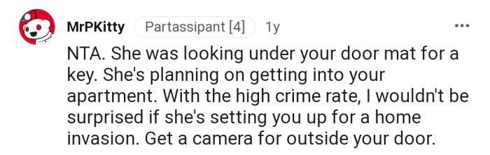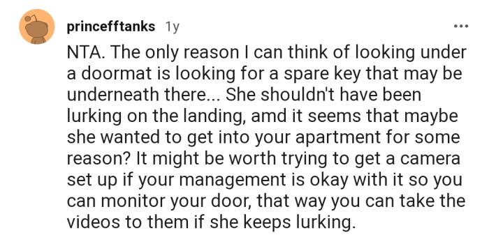 Shortly after, OP spotted her neighbor trying to peek beneath her door. What could the lady be looking for? Well, out of curiosity, OP decided to confront her in a rather interesting way.