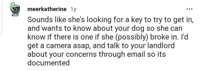 "Sounds like she's looking for a key to try to get in, and wants to know about your dog."