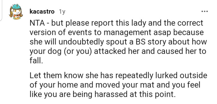 She swung open the door and allowed her dog to give the lady the scare of her life. Unfortunately, the woman fell backward pretty hard—but that didn't take away the satisfaction that OP felt from dealing with an obvious snooper.