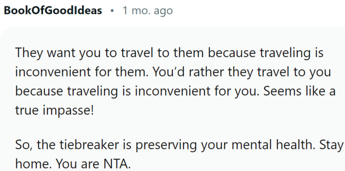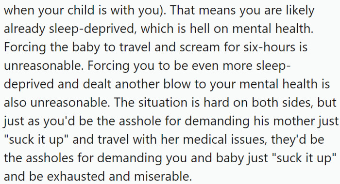 It is through these personal experiences that we gain valuable insights into managing the challenges and complexities that come with family life and the delicate balance between self-care and maintaining connections with loved ones. In OP's situation, the thought of a long and potentially distressing journey with a fussy six-month-old, combined with an uncomfortable stay and challenging ideological differences with their in-laws, has left them feeling overwhelmed and reluctant to make the trip.