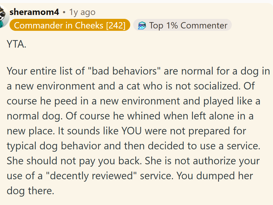 Sometimes the best solution isn’t a favor but a professional service. In this case, the dog ended up safe in daycare, but the friendship may need as much patching up as the living room floor.