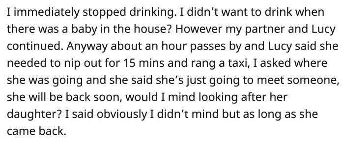 Another hour later, OP called for a cab, saying she had to meet someone for just 15 minutes, and asked if OP wouldn't mind taking care of her baby while she was out. OP said no, as long as Lucy came back in a few minutes, as she had said.