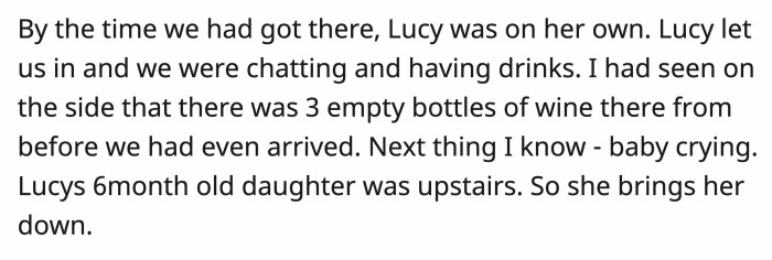 Suddenly, they heard a baby crying. OP and her partner had no idea that there was a child inside the house; OP immediately stopped drinking, feeling uncomfortable, while her partner and Lucy chatted merrily.
