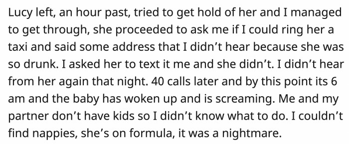 OP asked Lucy to text her instead, but she didn't, and OP didn't hear from her again for the rest of the night. Forty missed calls later, and it's 6 in the morning; the baby is crying, the diapers are nowhere to be found, and OP doesn't know what to do.