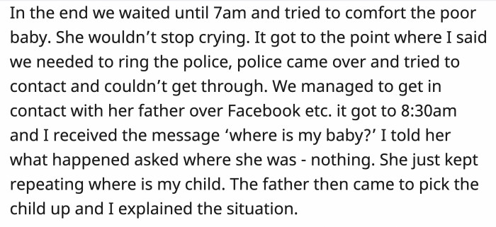 OP had no choice but to call the police, and when they arrived, they also tried calling Lucy, but even they couldn't get through. They managed to contact the father of the child through Facebook and relay what happened.
